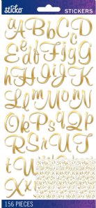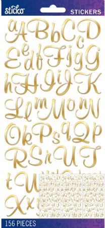 Stickers add the perfect finishing touch to your paper projects. Stickers can be a fun embellishment, a whimsical accent or add elegant polish to scrapbook pages, greeting cards, mixed media and more. This package contains Sticko Alphabet Stickers - Alpha Large, Gold Foil Script, 156 pieces.