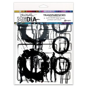 Dina Wakley MEdia Transparencies include 6 sheets of 8.5 x 10.75" (21.59cm x 27.3cm) clear sheets printed with black designs.  Featuring Dina's signature artwork, they are ideal for collaging into mixed media and journal pages.  Cut up or use as is, these clear transparencies are sure to add unique texture and dimension to mixed media pages.