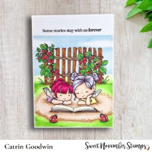 Step into the whimsical world of Sweet November Stamps Fairwee Readers Clear Stamp Set! This 3 x 4 inch clear set features two charming Fairwees lounging, a book, and two adorable ladybugs—perfect for creating storybook-inspired cards. Complete your designs with the included sentiments: 'So many books, so little time' and 'Some stories stay with us forever.' Made in the USA from high-quality photopolymer for precise, clear stamping every time.