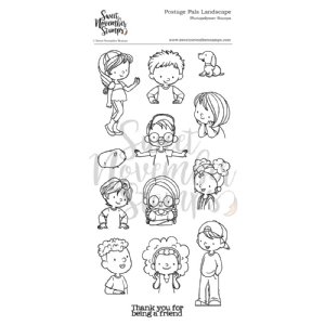 Add some postage-perfect charm to your projects with the Sweet November Stamps Postage Pals Landscape Clear Stamp Set! This 4 x 8 inch clear set includes 12 delightful character stamps designed to complement your postage dies in a landscape setting. Complete your design with the heartfelt sentiment: 'Thank you for being a friend.' Made in the USA from high-quality photopolymer for precise, clear stamping every time.
